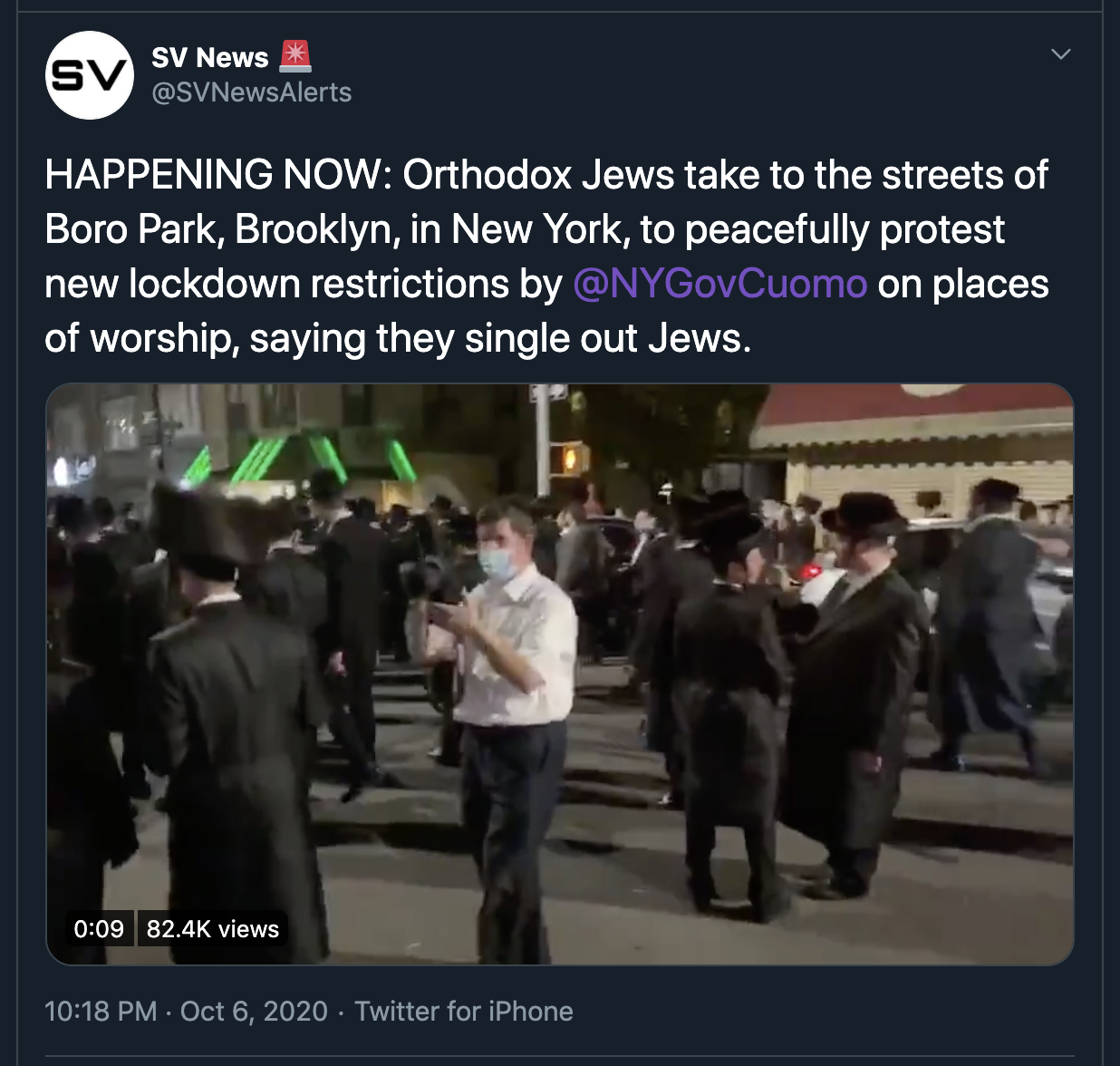 These tweets from @SVNewAlerts cover the New York City police dispersing the crowds gathered to celebrate the Sukkot holiday and the later protests of Governor Andrew Cuomo's lockdown of synagogues. The lockdown comes as COVID-19 spikes in nine New York City communities. -