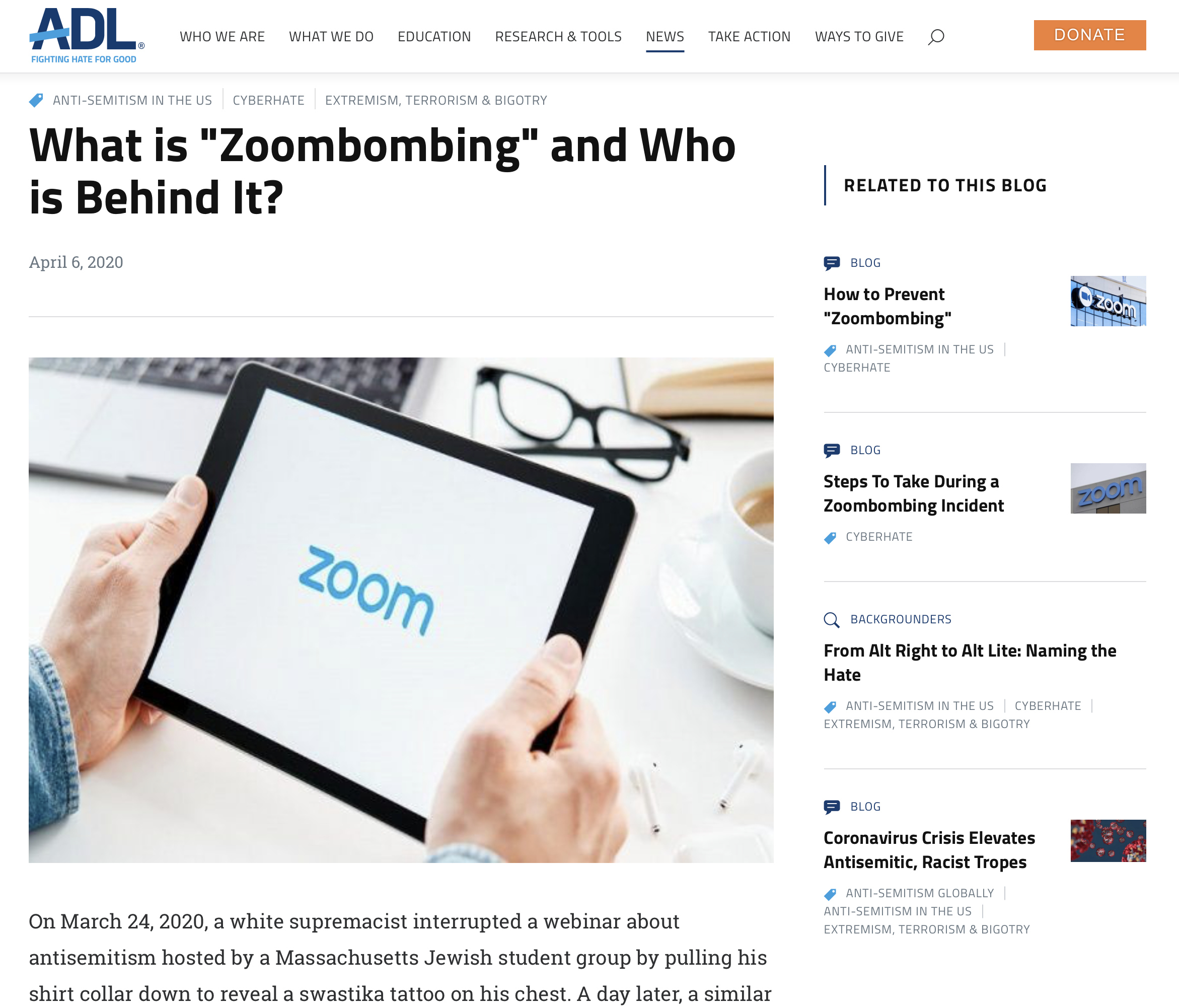 The ADL created a list of instances of antisemitic "Zoombombing," where perpetrators intruded on synagogue services, Torah classes, or other meetings held on the Zoom video conferencing service.
