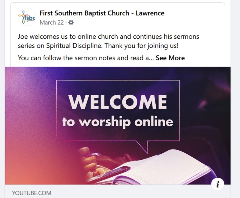 Until I moved away for college, I had always gone to First Southern Baptist Church in Lawrence, KS. I unexpectedly had to come back home due to the COVID-19 outbreak and everything has changed. In response to the stay-at-home order, my church has canceled all services until it is safe for everyone to meet together again. However, now we have recorded services on youtube that we watch as well as recorded worship sessions. Also, my dad is an adult Sunday school teacher, who instead of recording his teachings, has started holding online zoom sessions for his class. This helps everyone stay connected as a lot of people are not doing well in these troubling times.