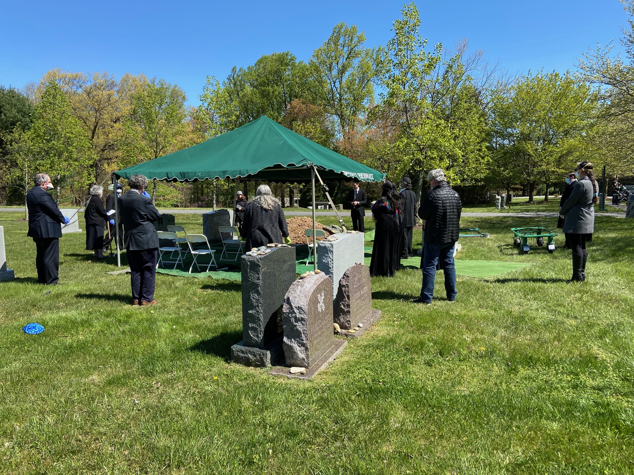 An image portraying how funerals have changed in response of the COVID-19 pandemic, including reduced attendance, face masks, and social distance between attendees.