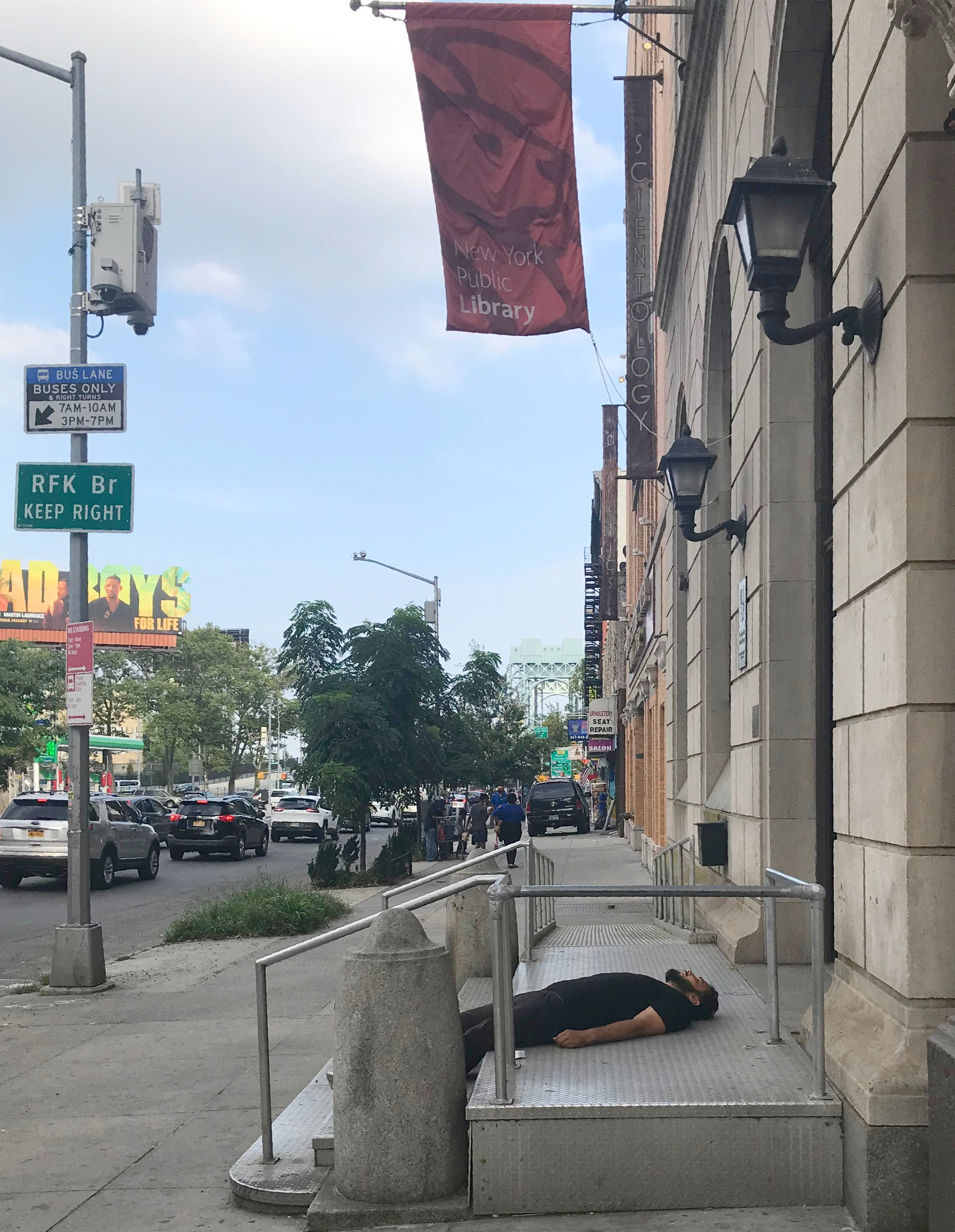 COVID- 19 closed public libraries where homeless rested securely during the day. Man on library steps may be returning to safety.