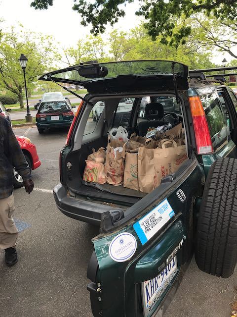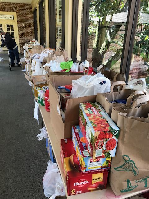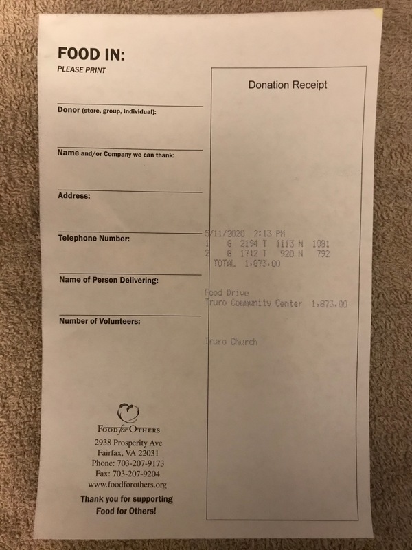 On May 9, 2020, Truro Anglican Church held a food drive for two food banks in Fairfax. Parishioners dropped off groceries from the trunks of their cars, which masked church staff stored in a long hallway. Later church volunteers drove the food to two different food banks. We learned that food banks measure food in pounds, as shown on the receipt from one of the food banks. This is just a small effort towards meeting the needs of our community.