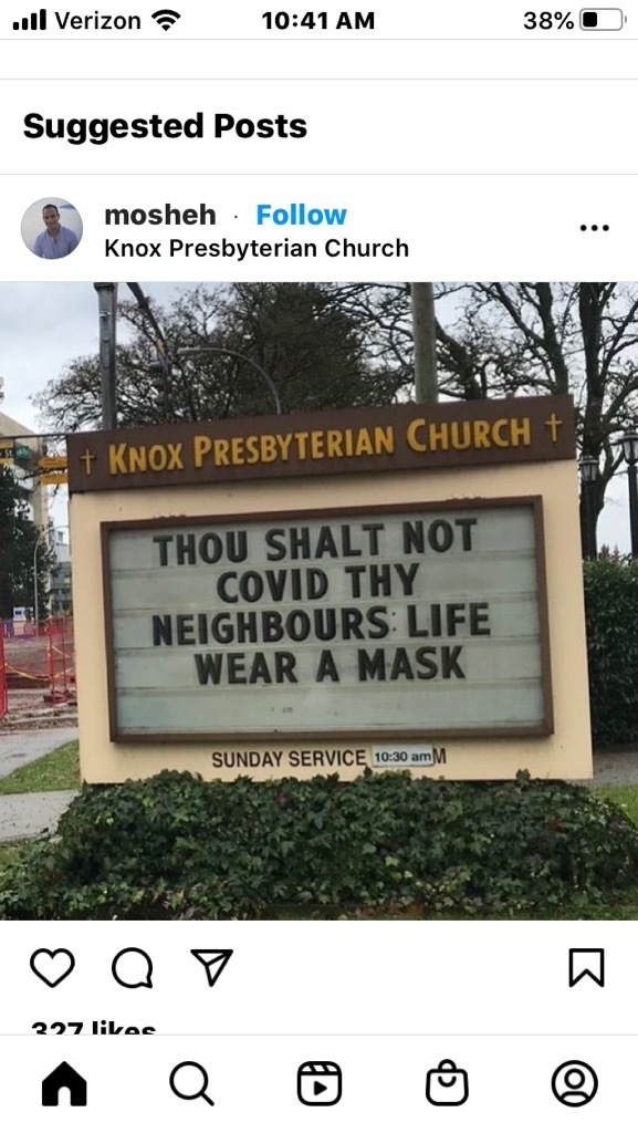 This screenshot from Instagram shows a picture of Knox Presbyterian Church's sign, which reads, "Thou shalt not COVID thy neighbors life. Wear a mask."