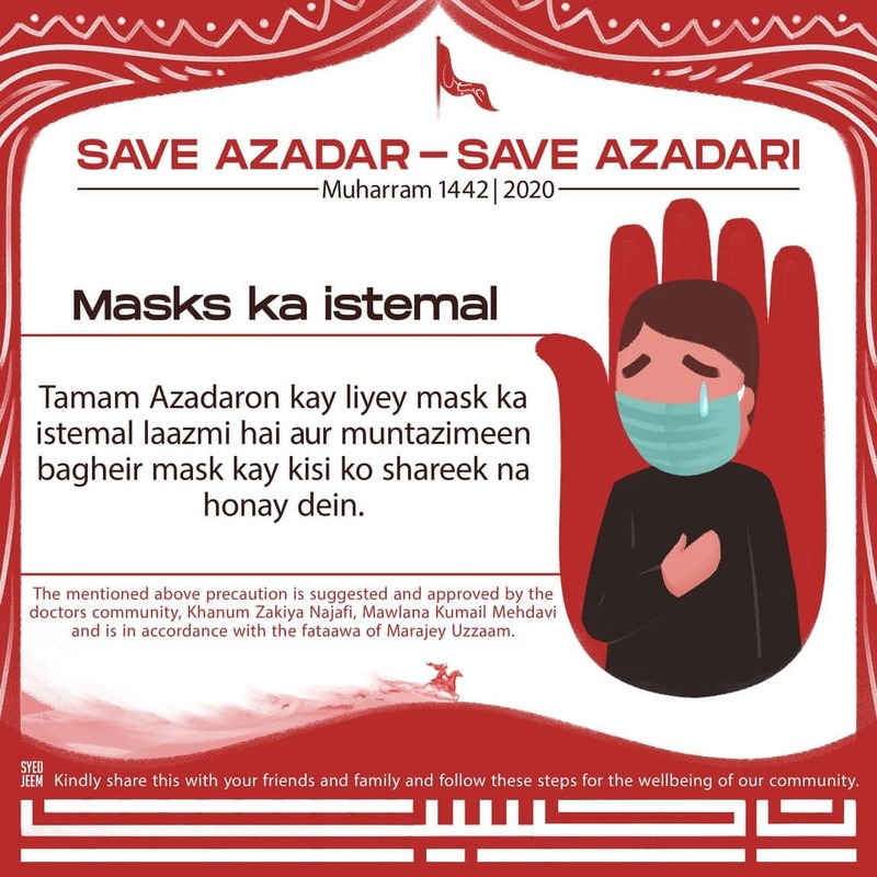 3. With a similar guiding message of “Save Azadar, Save Azadari”, this image carries an embedded invitation to share widely. The Urdu transliterated text reads: “For all azadars the use of a mask is compulsory. The management will not allow anyone to participate without a mask.” In its journey between users the image was often accompanied by the hashtags #ResponsibleAzadar #saveazadar #saveazadari