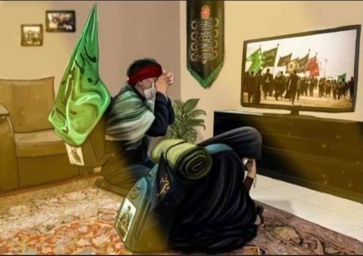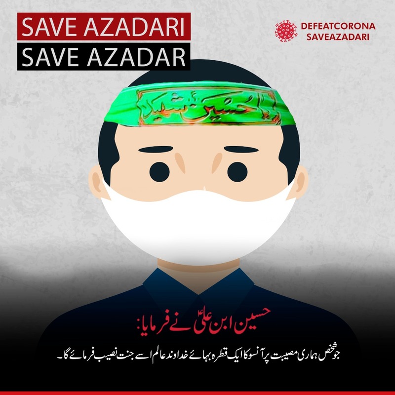 4. Depicting a masked pilgrim wearing a devotional green headband, the image is captioned in Urdu with the words, “Hussain ibn Ali said ‘Any individual who sheds even a single tear for our troubles will be rewarded by Allah with a place in heaven”. Shared widely on social media, the image was often pegged to the hashtags #SaveAzadariSaveAzadar #DefeatCoronaSaveAzadari.