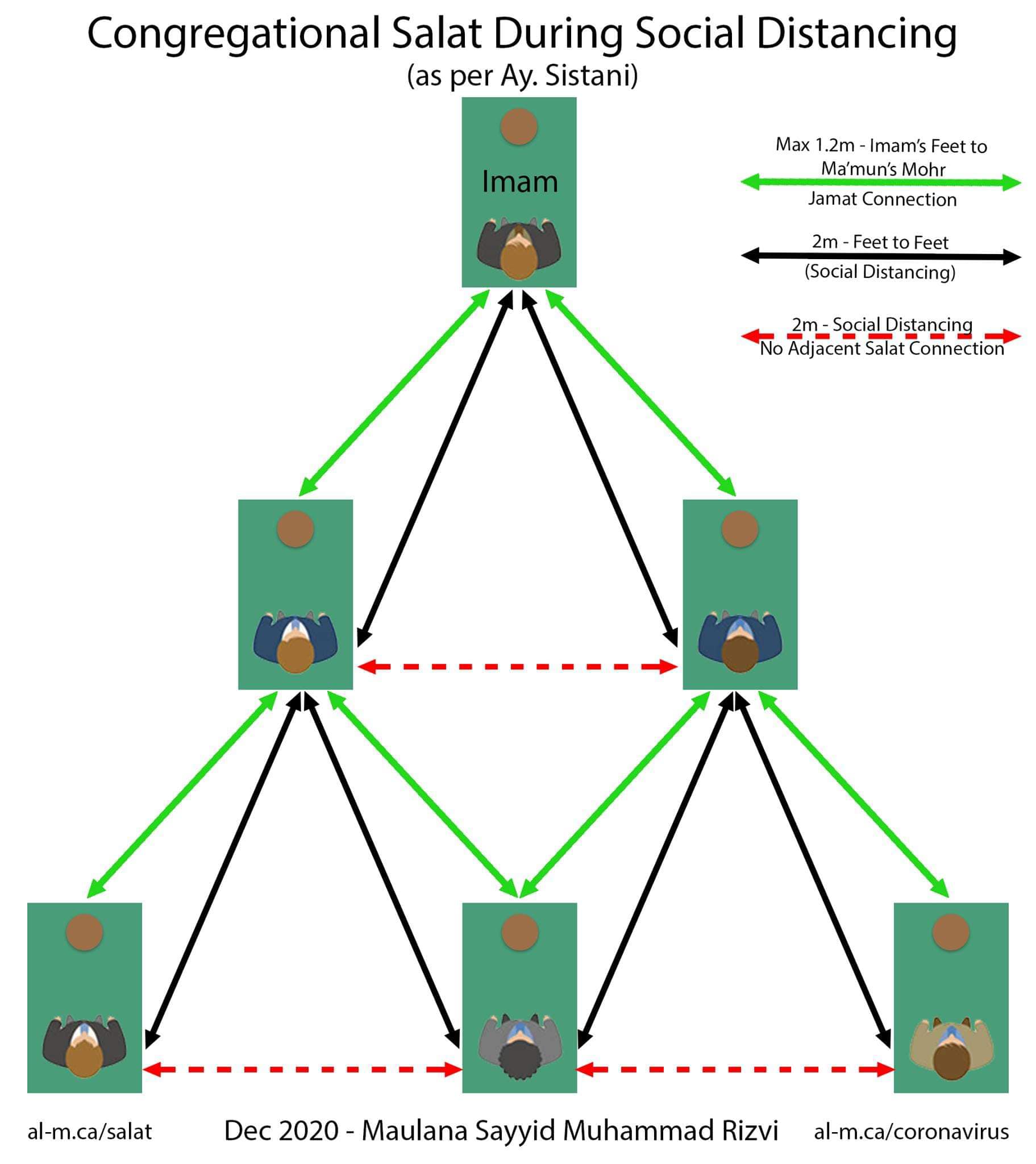 1. A diagram showing congregational salat [prayers] during social distancing, produced by Al-Maarif Foundation, a Canadian Shi’a Ithna ‘Ashari publisher. The diagram was produced by Maulana Sayyid Muhammad Rizvi after sending a question to Ayatullah Sistani's office in Najaf, Iran, regarding the utility of a diagonal connection in congregational prayer during COVID-19.