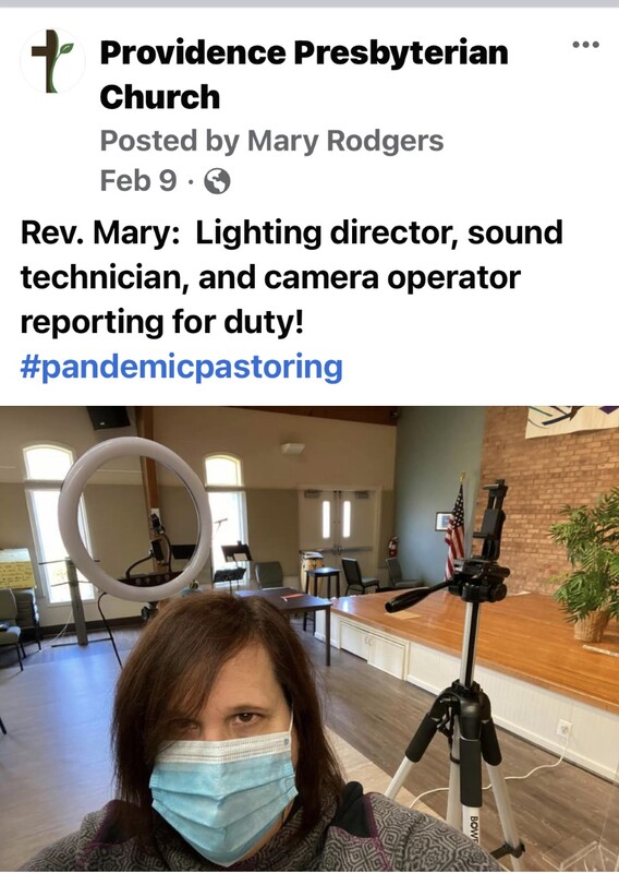 Social media post by Rev. Mary Rodgers of Providence Presbyterian Church showing lights and cameras in preparation for filming a digital sermon.
