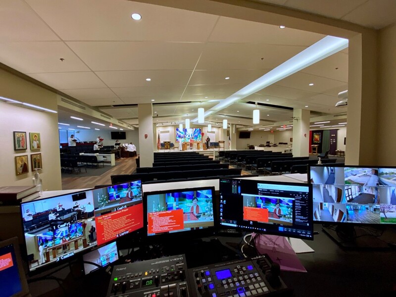 Behind the scenes photo of computers set up to record and edit digital sermons along with various other equipment at Church of the Epiphany Anglican .