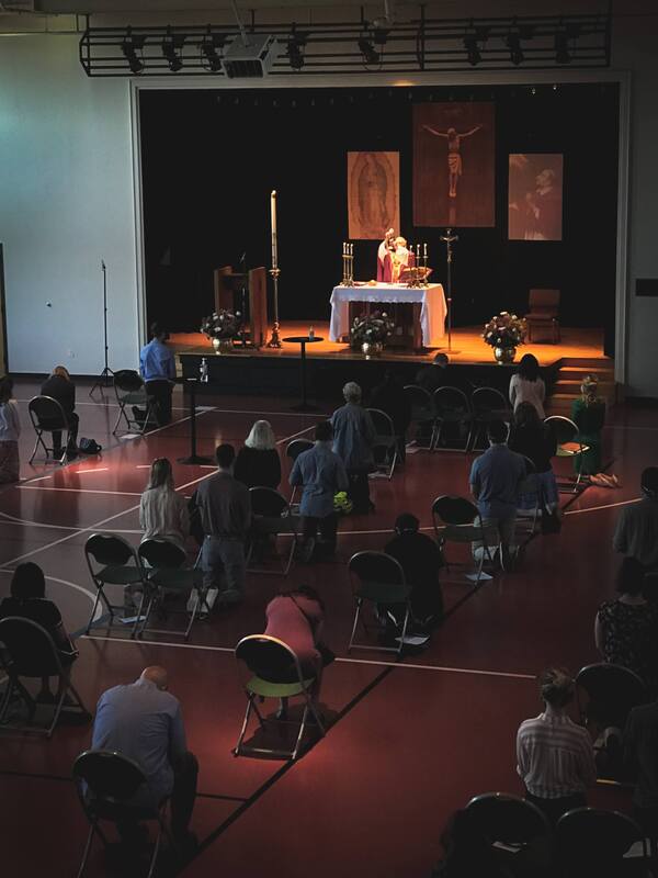 When restrictions were lifted, we started invited people back to Mass. To ensure safety, we held Mass in the gym to ensure that households were comfortable staying 6ft apart.