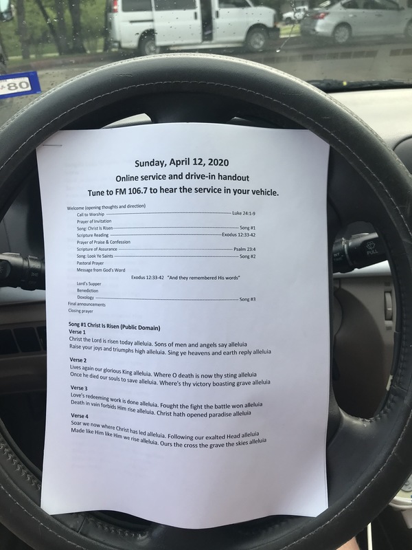 This year's Easter service was unlike any I have experienced before. Unable to gather together face-to-face, we sought to be together (while remaining appropriately socially distanced) by having a drive-in service in the church parking lot, complete with music and sermon being broadcast over the radio. Noting this strikingly unusual view of an Easter bulletin -- juxtaposed against a steering wheel and a rainy windshield -- I snapped a photo.