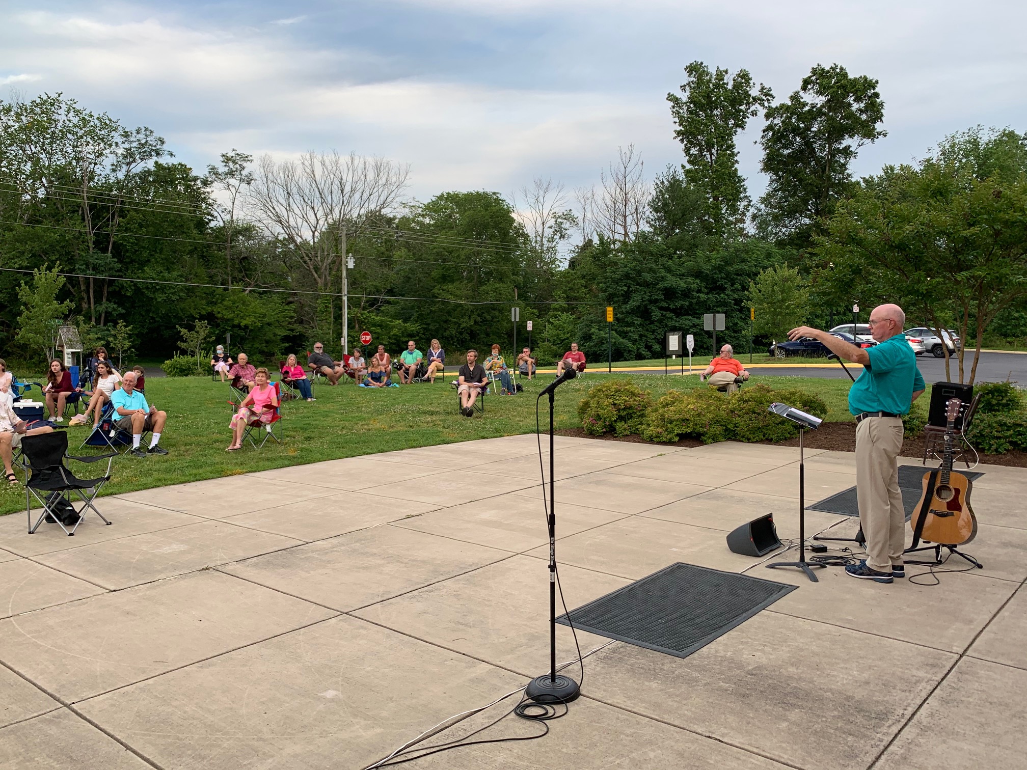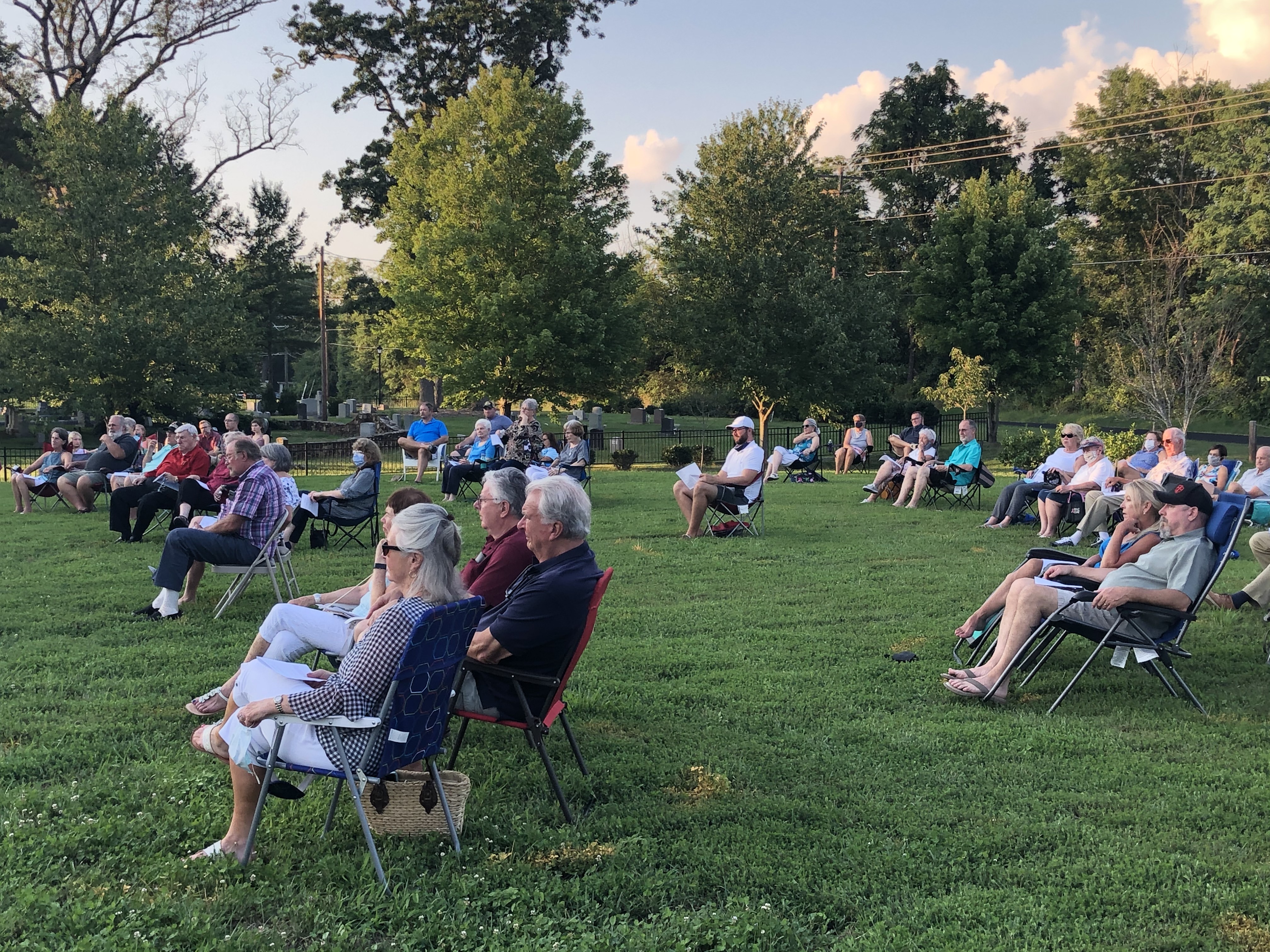 Greenwich Presbyterian Church having a church meeting outside while maintaining social distancing.