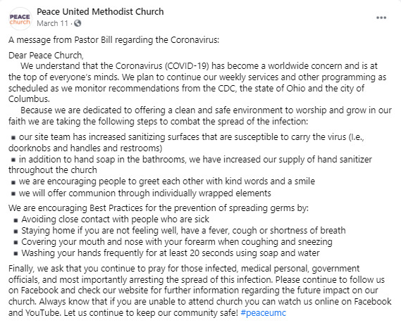 Peace United Methodist Facebook Updates during the month of March