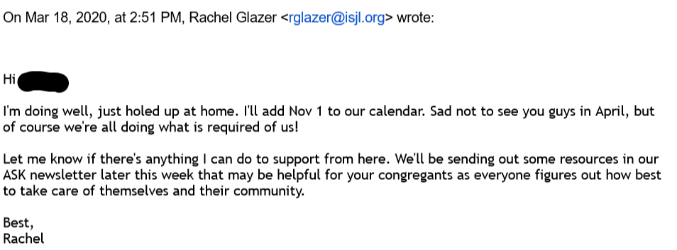 Email from Institute of Southern Jewish Life Program Manager Rachel Glazer to Congregation Beth Yeshurun in Houston, Texas. This communication concerns the cancellation and rescheduling of a planned Act, Share, Keep (ASK) Jewish social justice program in April due to COVID-19.
