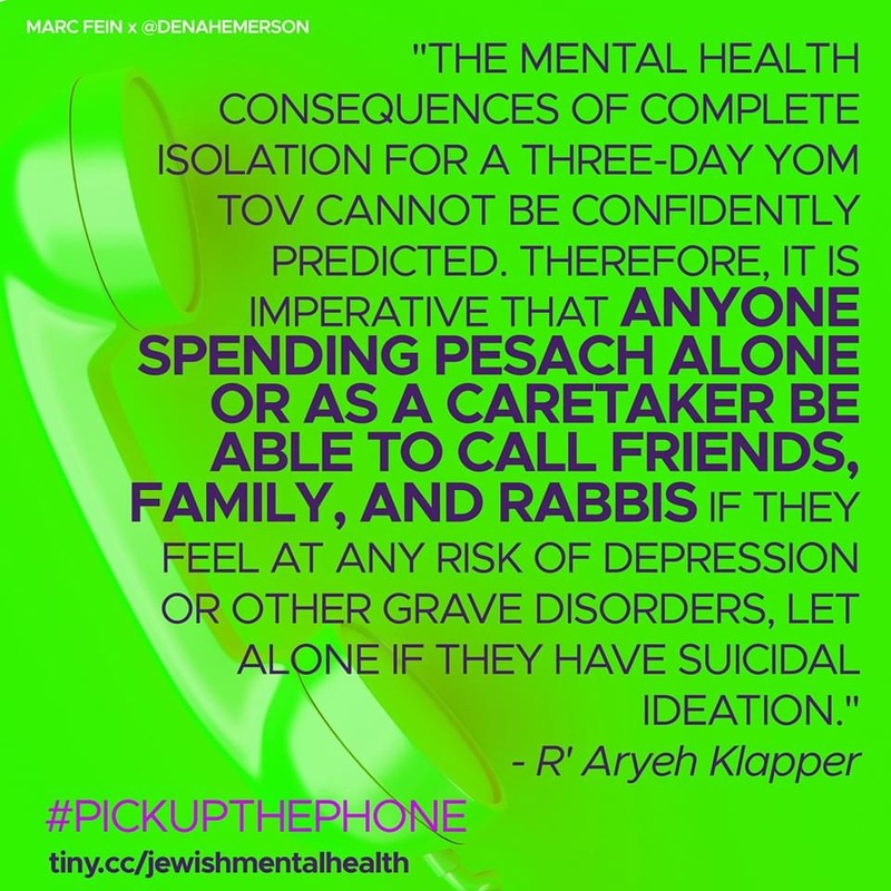 As COVID-19 affects the way people interact, this advert prompts people to reach out if they are spending Pesach alone or as a caretaker, especially if they are prone to depression and suicidal ideation. A url listed on the image (tiny.cc/jewishmentalhealth) brings users to a Google Sheet with volunteers people can reach out to.