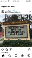 This screenshot from Instagram shows a picture of Knox Presbyterian Church's sign, which reads, "Thou shalt not COVID thy neighbors life. Wear a mask." -