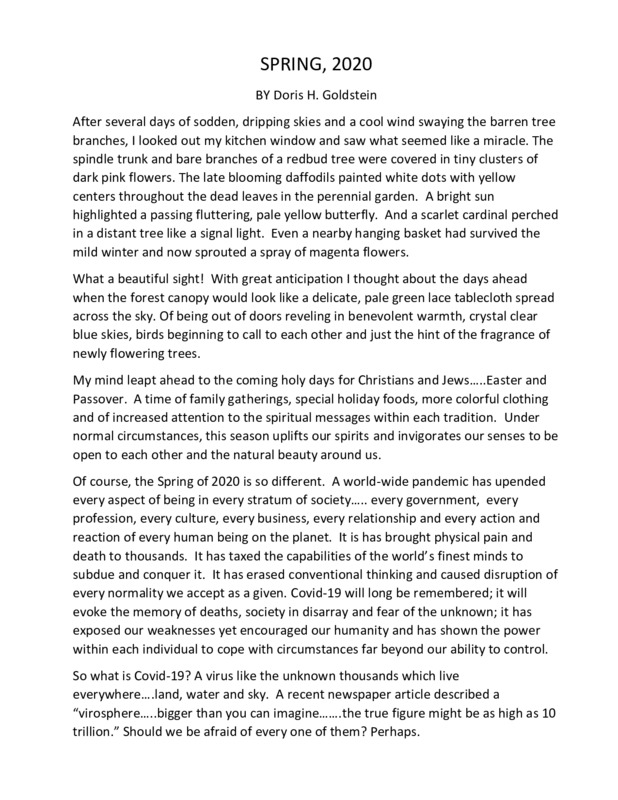 Essay, "Spring, 2020" by Doris H. Goldstein