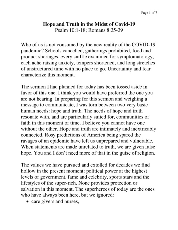 Sermon, March 22- Hope and Truth in the Midst of Covid-19 (Psalm 10)
