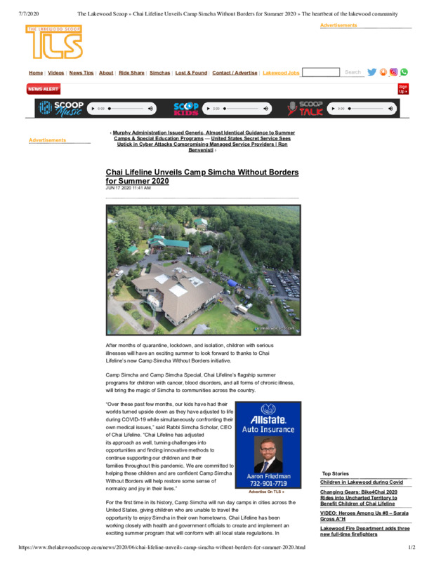 Chai Lifeline Unveils Camp Simcha Without Borders for Summer 2020