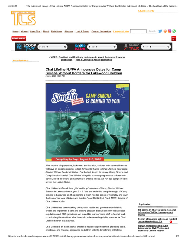 Chai Lifeline NJ/PA Announces Dates for Camp Simcha Without Borders for Lakewood Children