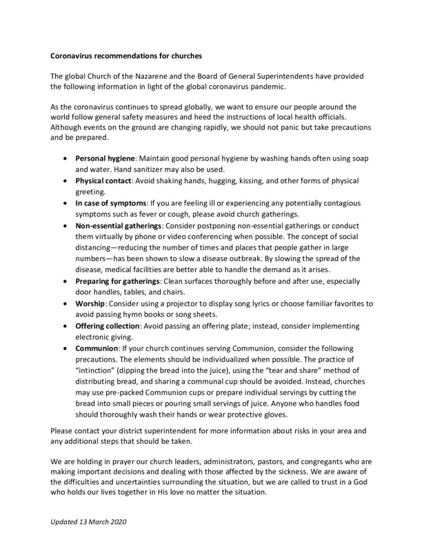 Part of Church of the Nazarene statement on coronavirus and guidelines for local churches