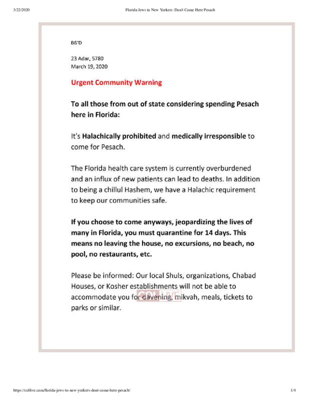 Part of Florida Jews to New Yorkers: Don't Come Here Pesach