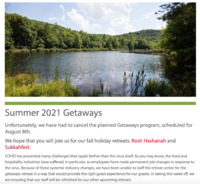 Unfortunately, we have had to cancel the planned Getaways program, scheduled for August 8th. We hope that you will join us for our fall holiday retreats: Rosh Hashanah and Sukkahfest. COVID has presented many challenges that ripple farther than the virus itself. As you may know, the food and hospitality industries have suffered, in particular, as employees have made permanent job changes in response to the virus. Because of these systemic industry changes, we have been unable to staff the retreat center for the getaways retreat in a way that would provide the right guest experience for our guests. In taking this week off, we are ensuring that our staff will be refreshed for our other upcoming retreats. -