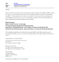Email notifying BBYO community of special event happening with actor Adam Kantor and lyricist Benj Pasek. The event will include a special announcement in which the guests will announce to those watching on the platform. The document contains details of the event as well as encouragement to share the event on social media. -