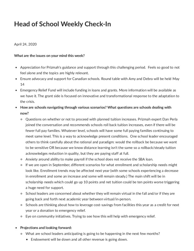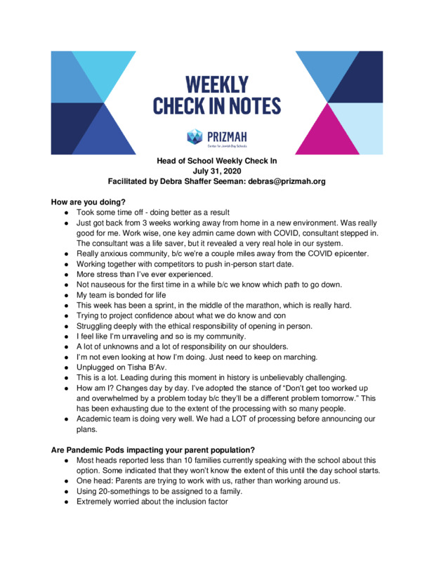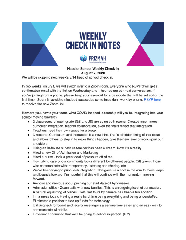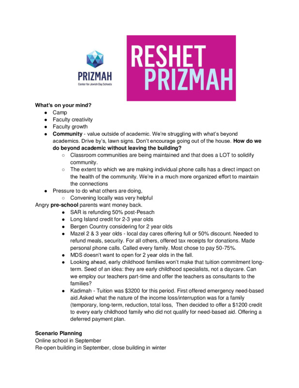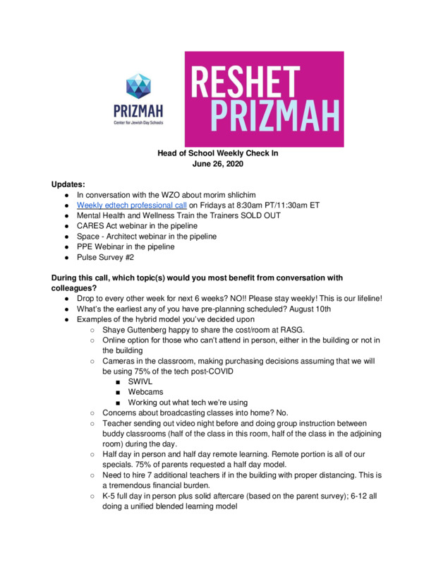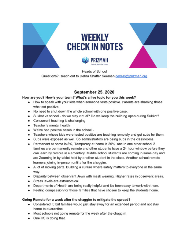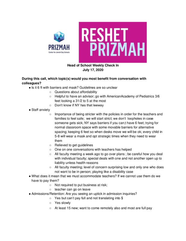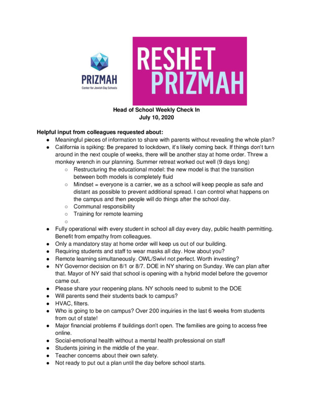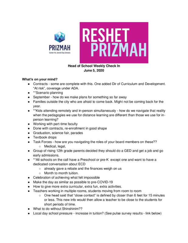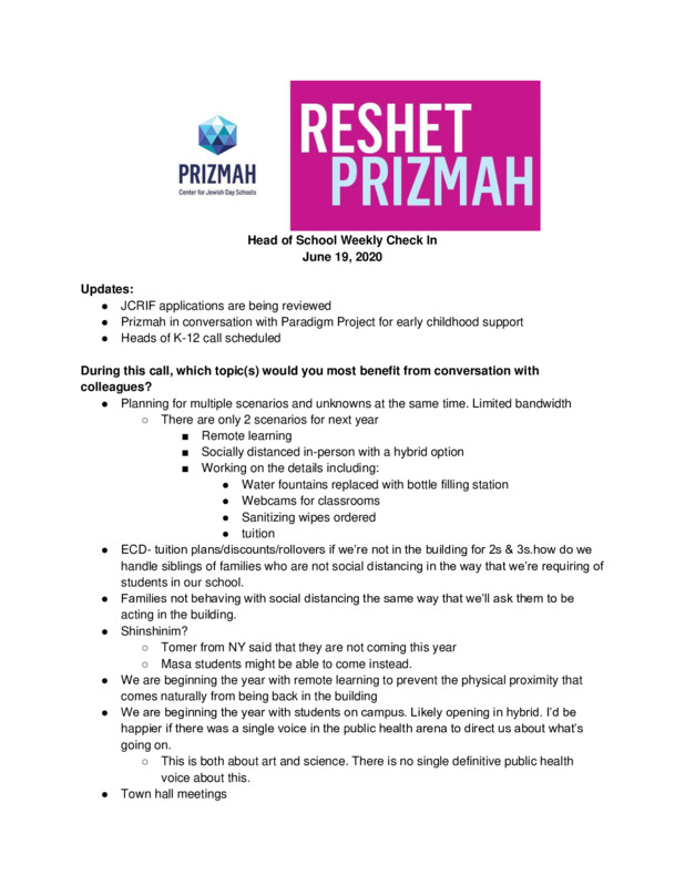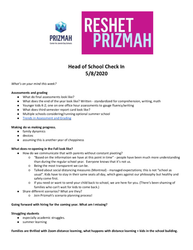 Prizmah COVID-19 Heads of School Weekly Calls