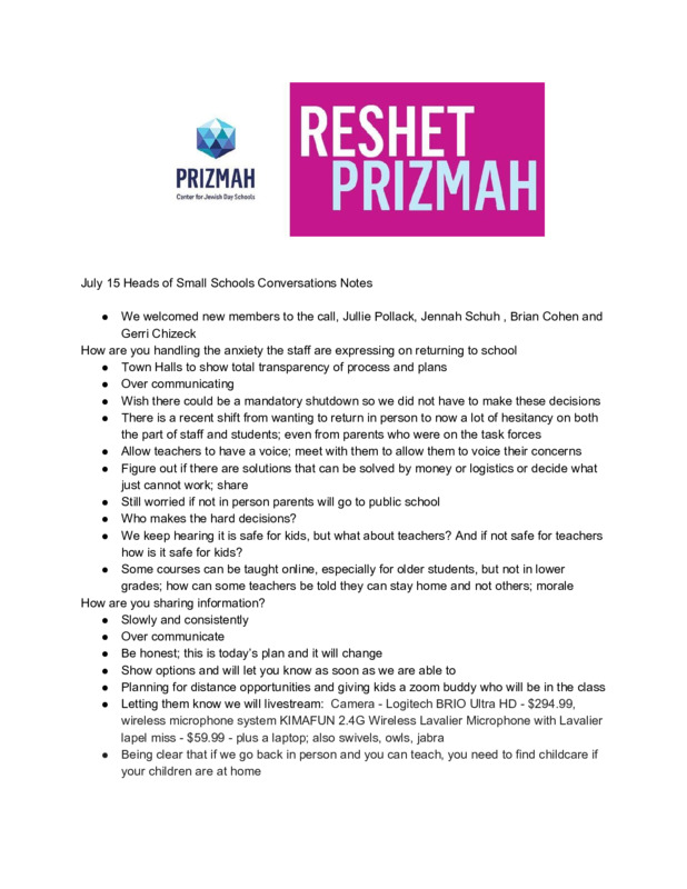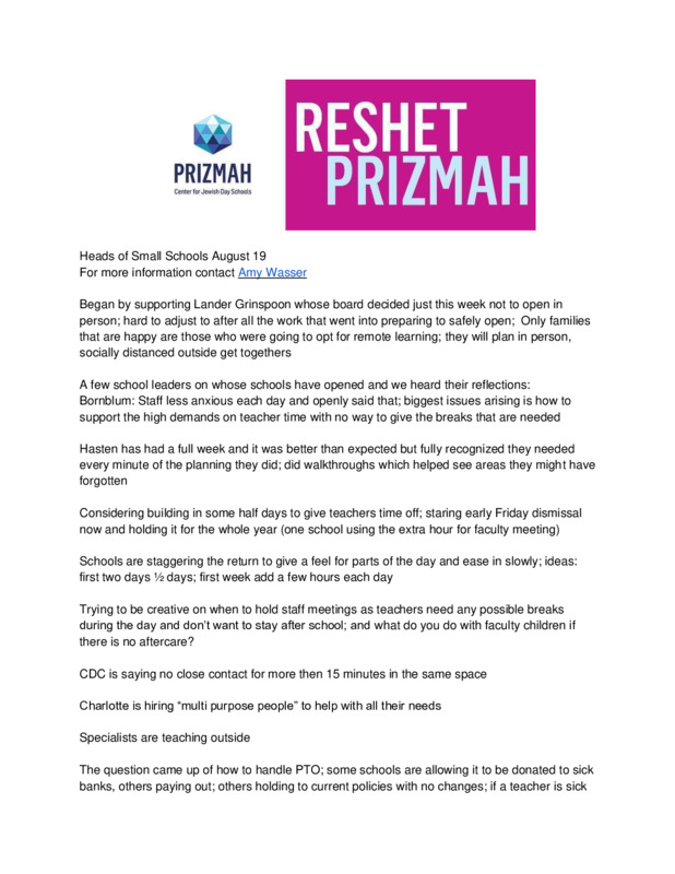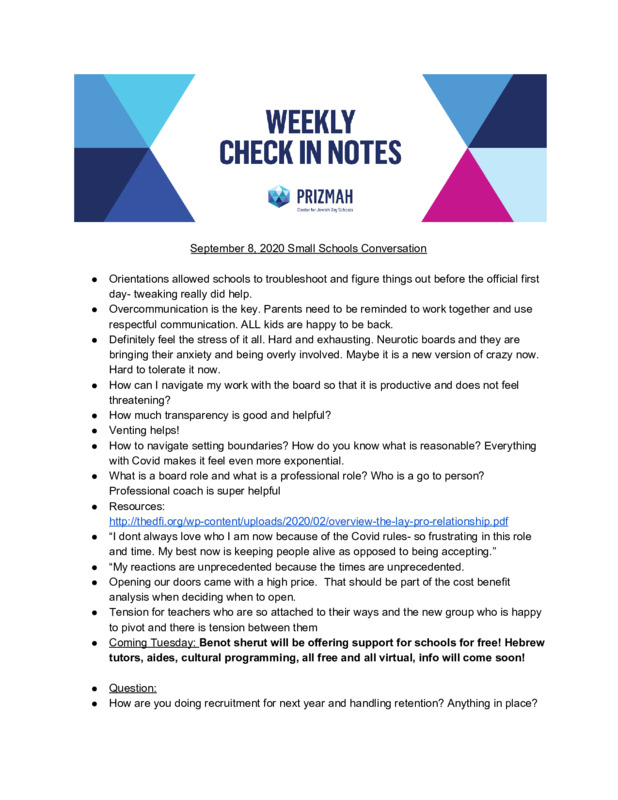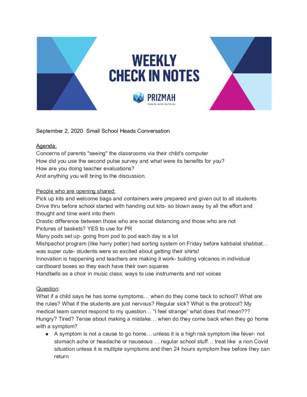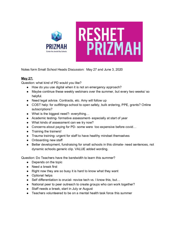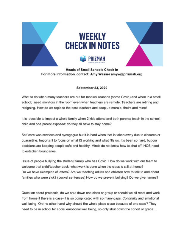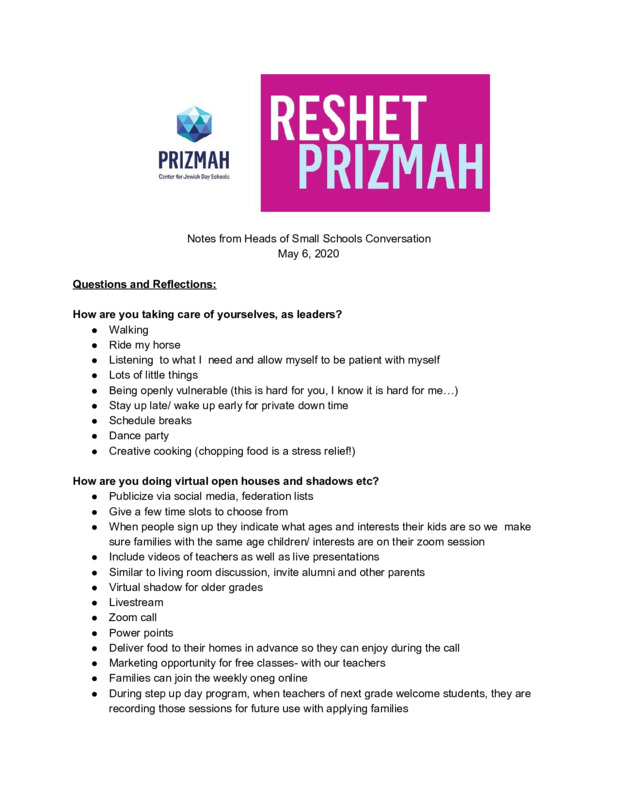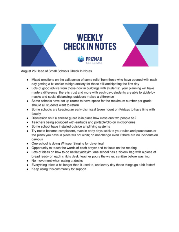 Prizmah Heads of Small Schools Check In Notes