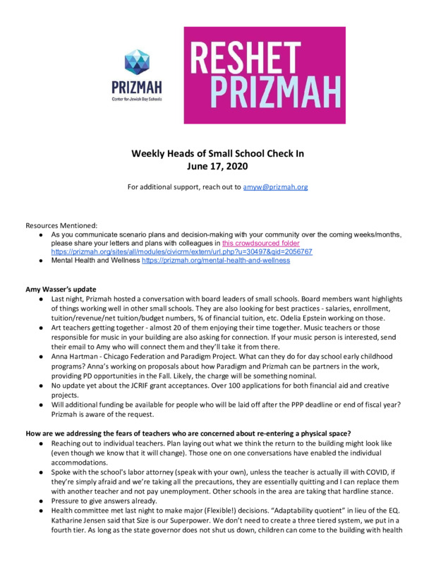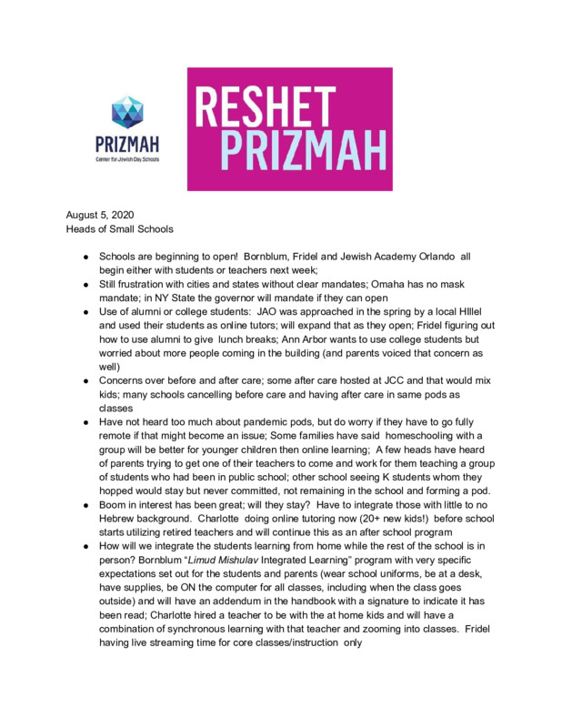 Prizmah is the network for Jewish day schools across North America. In their effort to support school leaders, Prizmah is regularly convening Heads of School for weekly calls. These calls offer support for the Heads of School, as well as asking them what Prizmah can do to help them navigate through these difficult times.