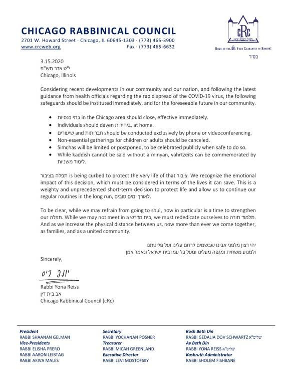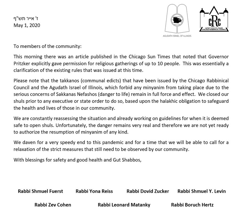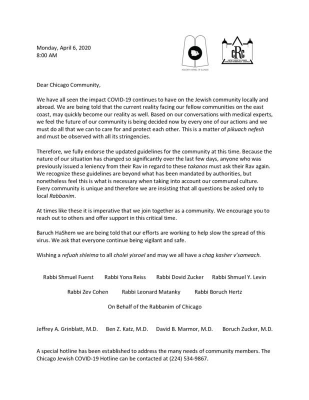 Letters from the Chicago Rabbinical Council on community guidelines during the COVID-19 pandemic