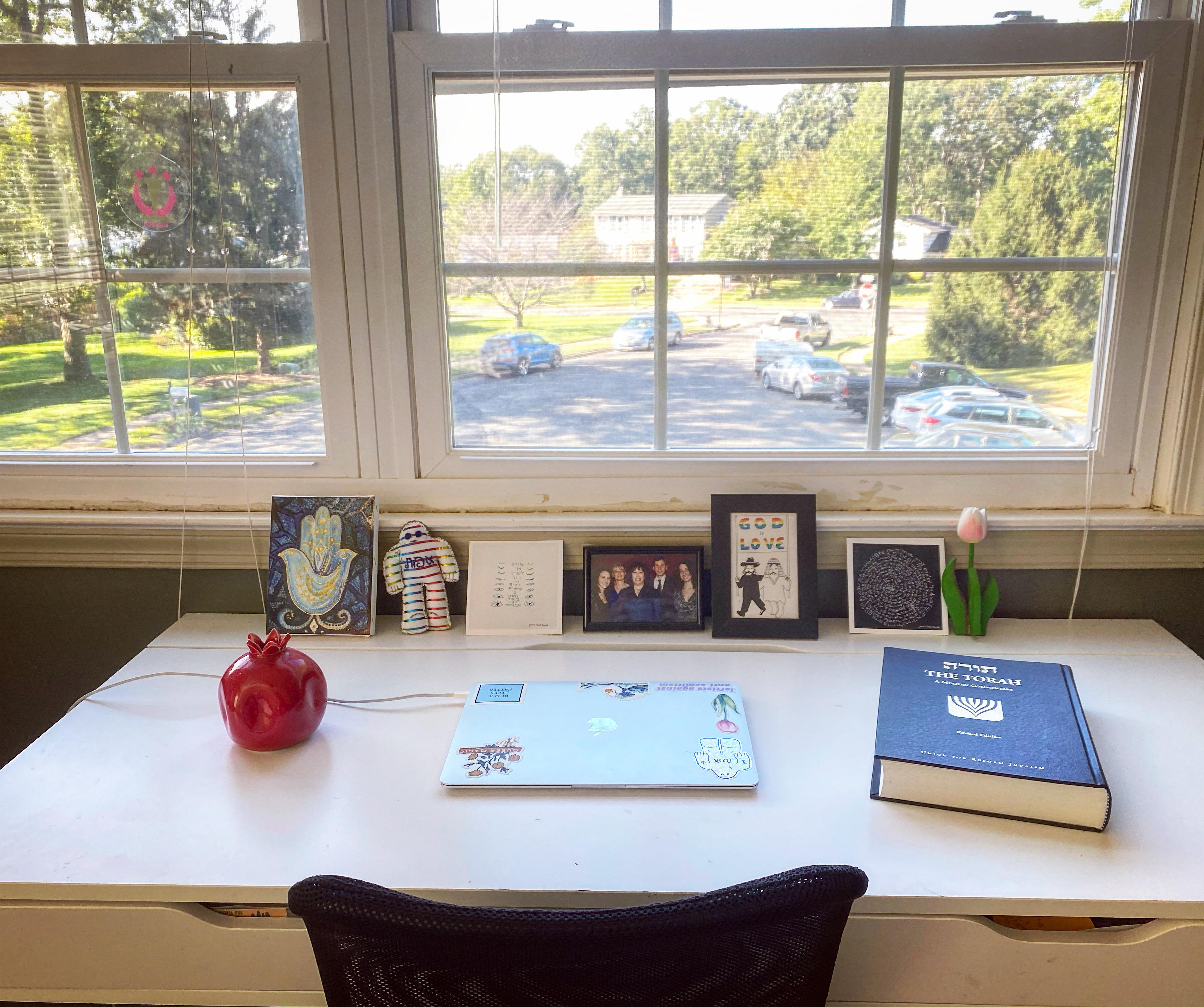 To prepare for virtual Rosh Hashanah morning services, I decorated my desk with Jewish art, objects, and a picture of my family in order to foster the feeling of being in a sacred space.