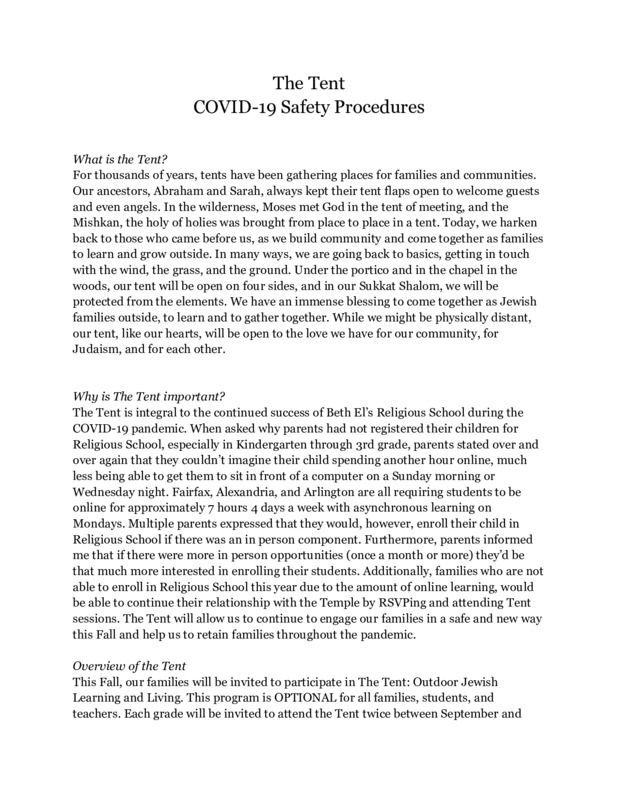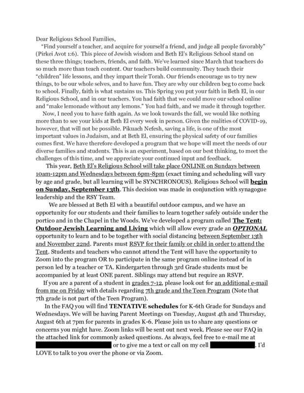 These items include safety protocols for Beth El Hebrew's Outdoor Jewish learning and living program that took place from September 13-November 22 and that picked up again April 11-May 23. Also attached is their letter announcing their plans for RS for 2021, as well as photos from Confirmation and Consecration.