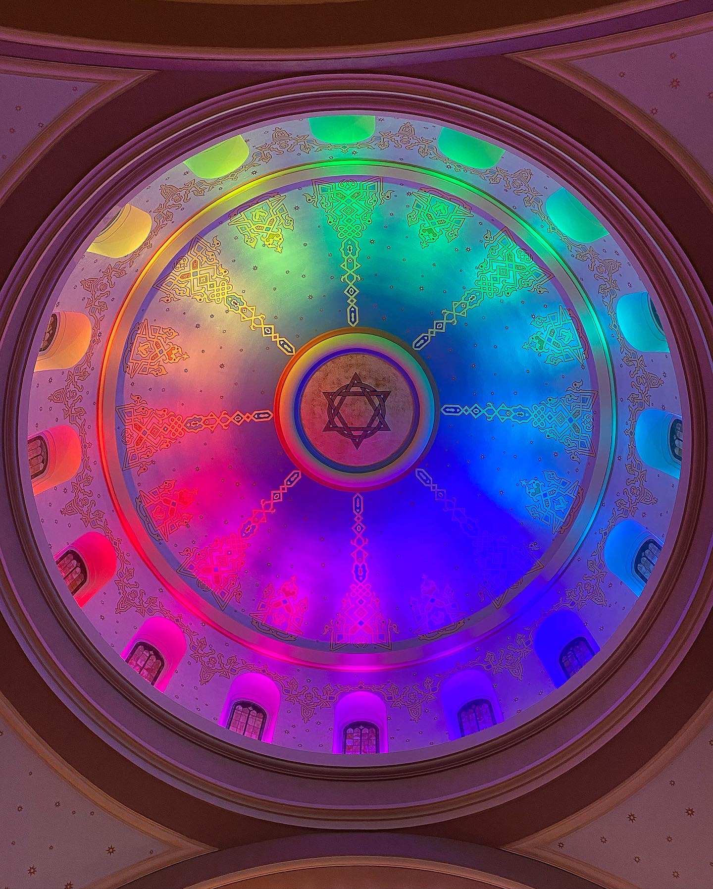 In the second picture, the dome on the ceiling of the sanctuary with a Jewish star at the center is lit up in rainbow colors.