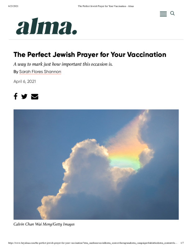An article written by Sarah Flores Shannon for Alma entitled "The Perfect Jewish Prayer for Your Vaccination."