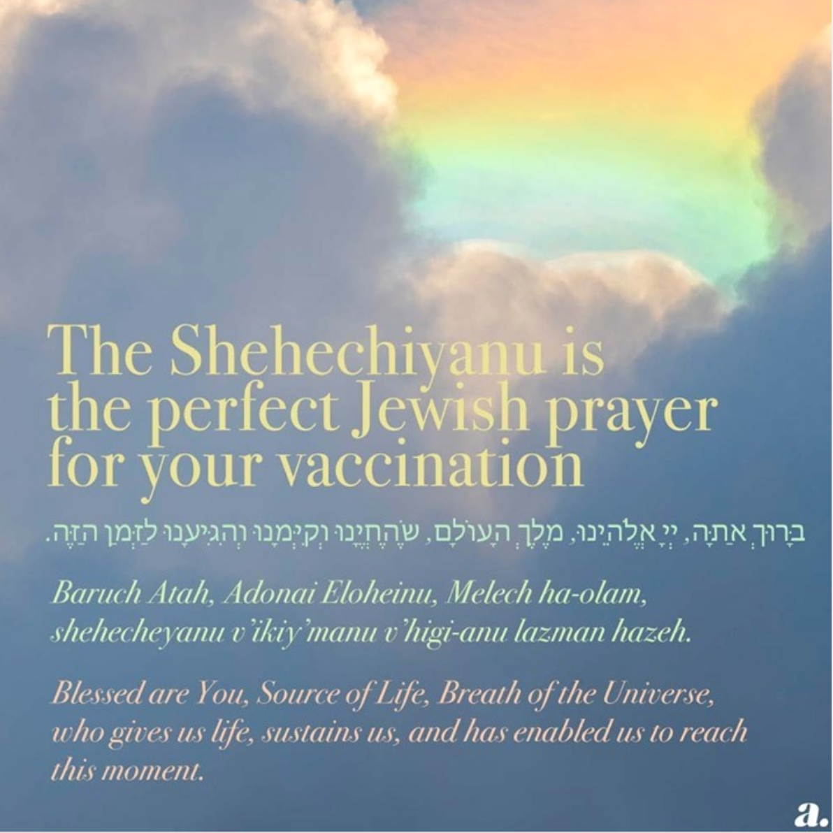 Image description via Alma's instagram: Image of a rainbow peeking through clouds. Text reads "The Shehechiyanu is the perfect Jewish prayer for your vaccination," with the Hebrew, transliteration, and English text: