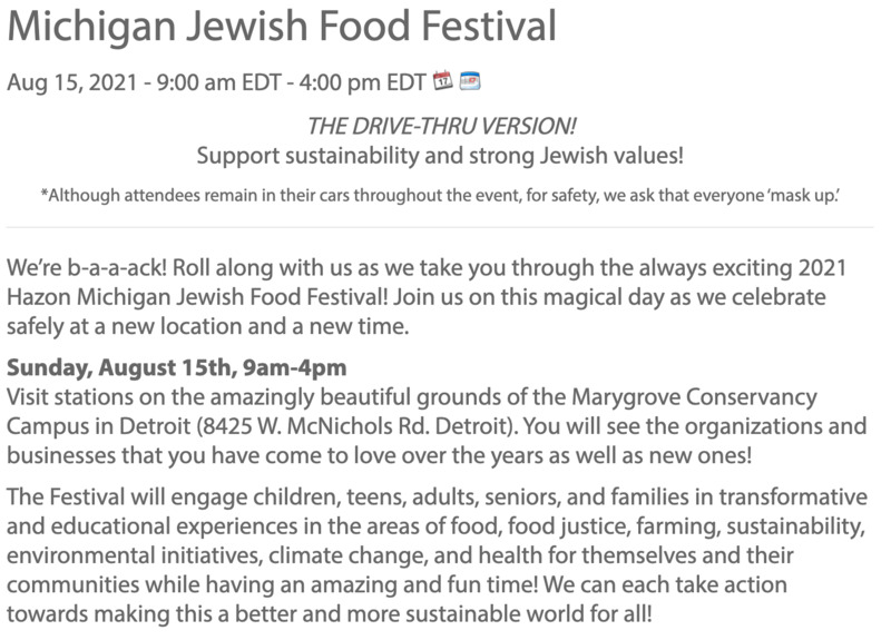 We’re b-a-a-ack! Roll along with us as we take you through the always exciting 2021 Hazon Michigan Jewish Food Festival! Join us on this magical day as we celebrate safely at a new location and a new time.