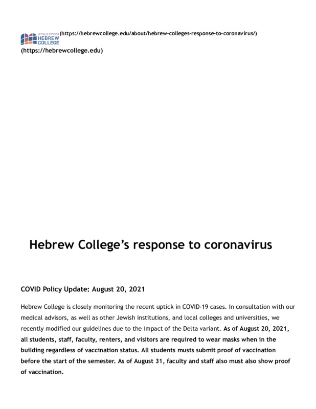 Hebrew College updates its students and staff on an updated policy in response to the Delta Variant of COVID-19. As of August 20, 2021, all students, staff, faculty, renters, and visitors are required to wear masks when in the building regardless of vaccination status. Additionally, all students and faculty must also show proof of vaccination.