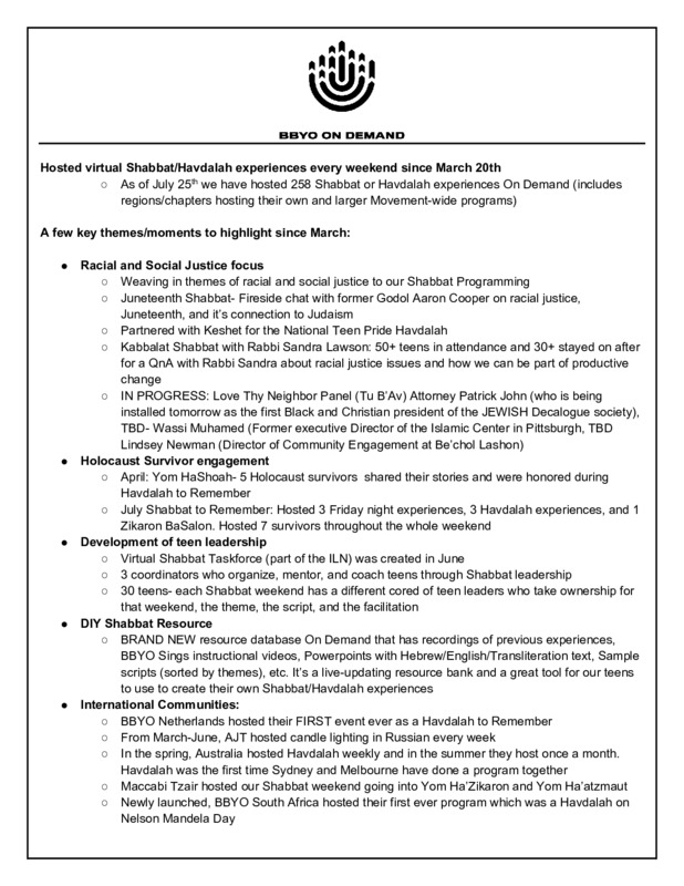This flyer provides information on BBYO's digital space created in the wake of the COVID-19 pandemic. The document highlights some events that were hosted on the platform.