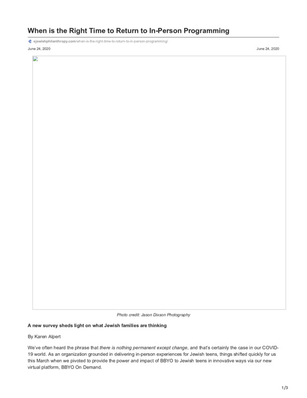 The article, written by Vice President of IT Strategy and Measurement at BBYO, Karen Alpert, summarizes the main takeaways from a 2020 BBYO survey sent to parents of members. The survey focused on questions regarding parents' opinions on resumption of in-person programming, on BBYO's response to the pandemic, and the financial impact on families.