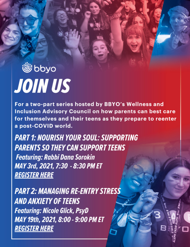 Flyer for two events for BBYO parents to attend. The events are focused on preparing parents for a post-pandemic world when teens return to school and normalcy.