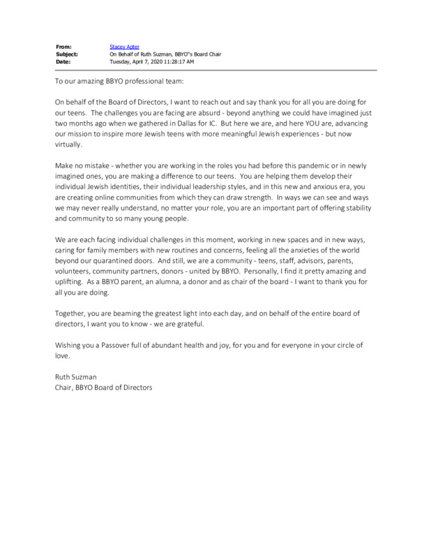 An email from the BBYO Board Chair to the professional team thanking them for their work during the pandemic transitional period.