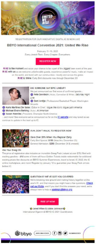 Flyer for the BBYO International Convention with lineup of speakers. Some speakers that are planned to speak are comedian Pete Davidson and basketball player Deni Avdija.
