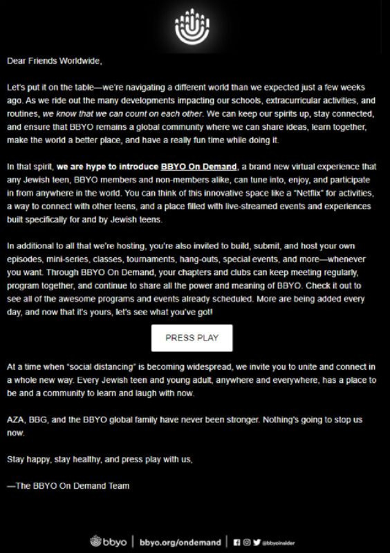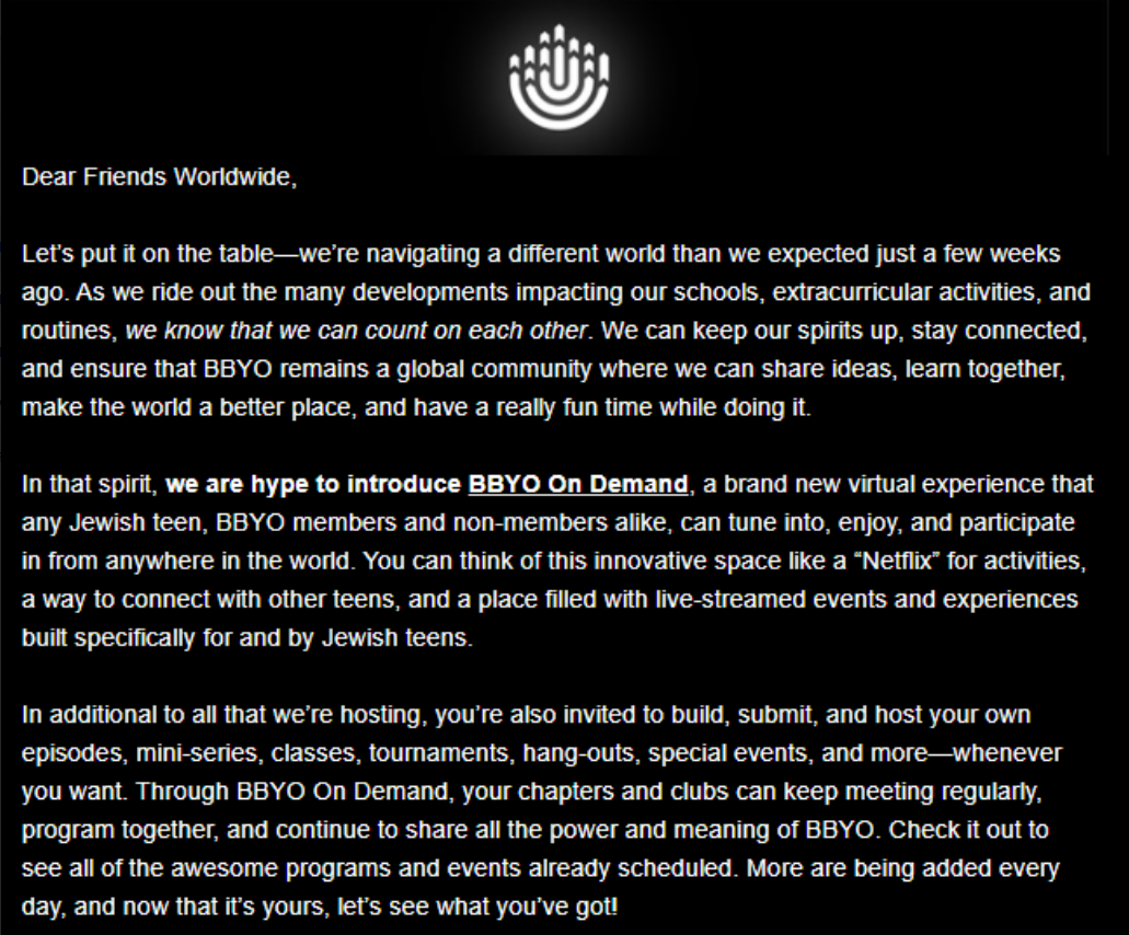 Email announcing the new online platform, BBYO On Demand. The platform was created in response to the sudden quarantine mandate in March 2020.