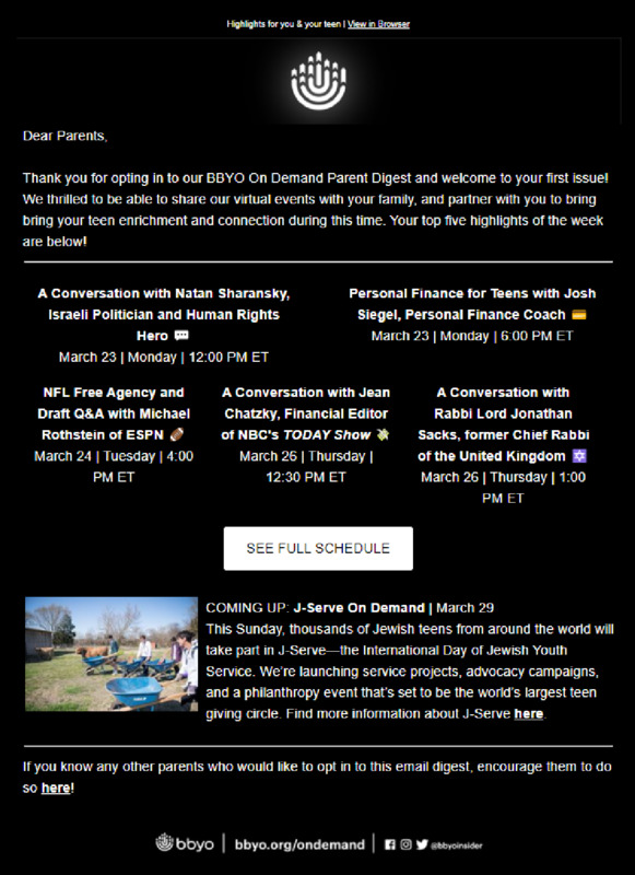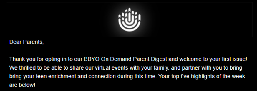 This email is the first issue of the BBYO On Demand Parent Digest. The newsletter is meant to keep BBYO parents up to date on upcoming events.