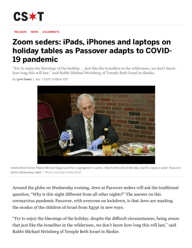 This Chicago Sun Times article covers how Jews are adapting their Passover seders and traditions in the midst of the COVID-19 pandemic