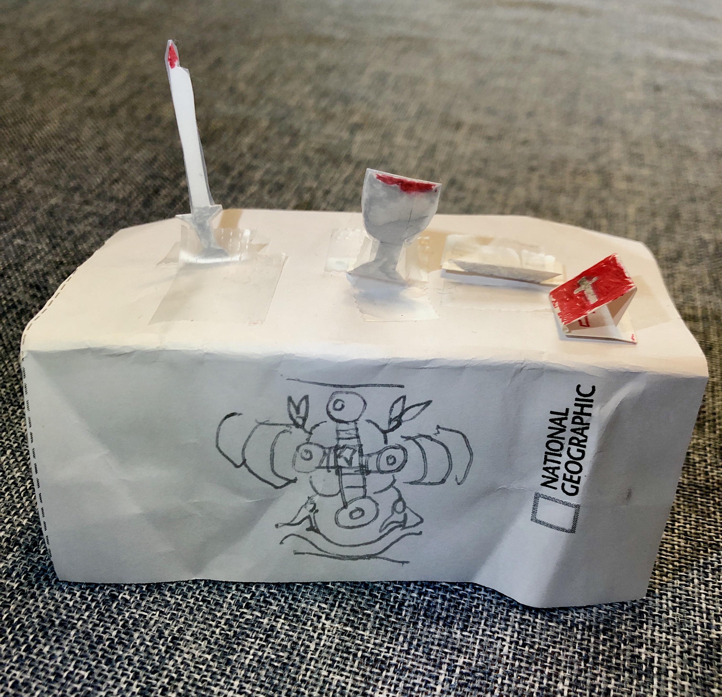 For the first several weeks of the lockdown, my church had not yet figured out how to distribute the consecrated elements for Holy Communion. But one Sunday my daughter made this Eucharistic altar out of scrap paper and tape, featuring a chalice, paten, Book of Common Prayer, and candlestick.