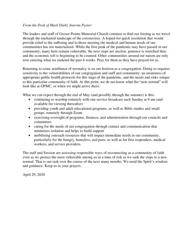 Part of A Religious Response to Covid-19 from a Presbyterian Community of Faith Near Detroit